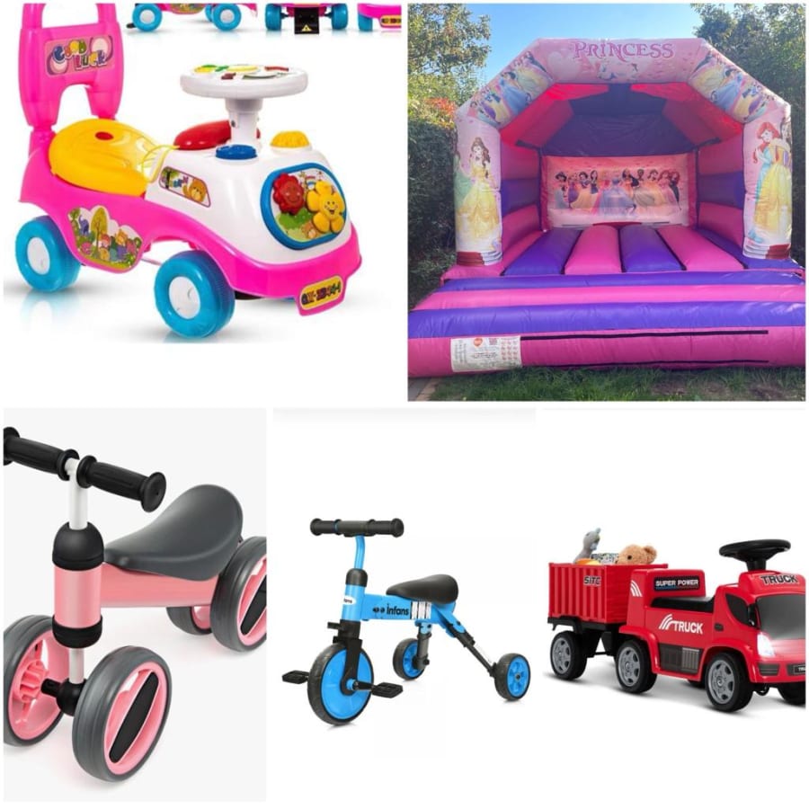 Let us take some of the stress of your back and make life easier. Here you have a princess bouncy castle with 5 toy car and bikes for the under 5 years olds.